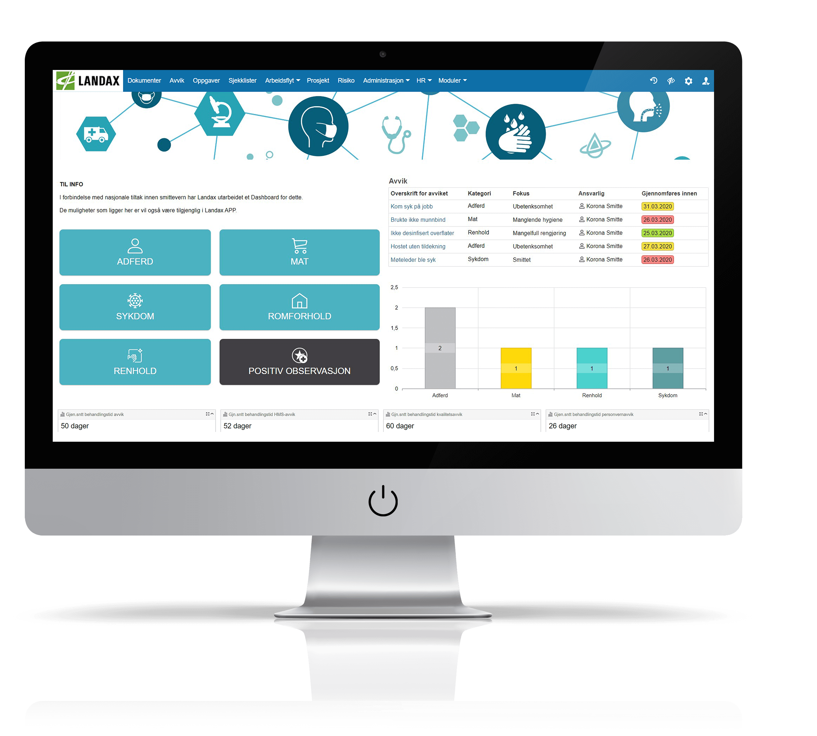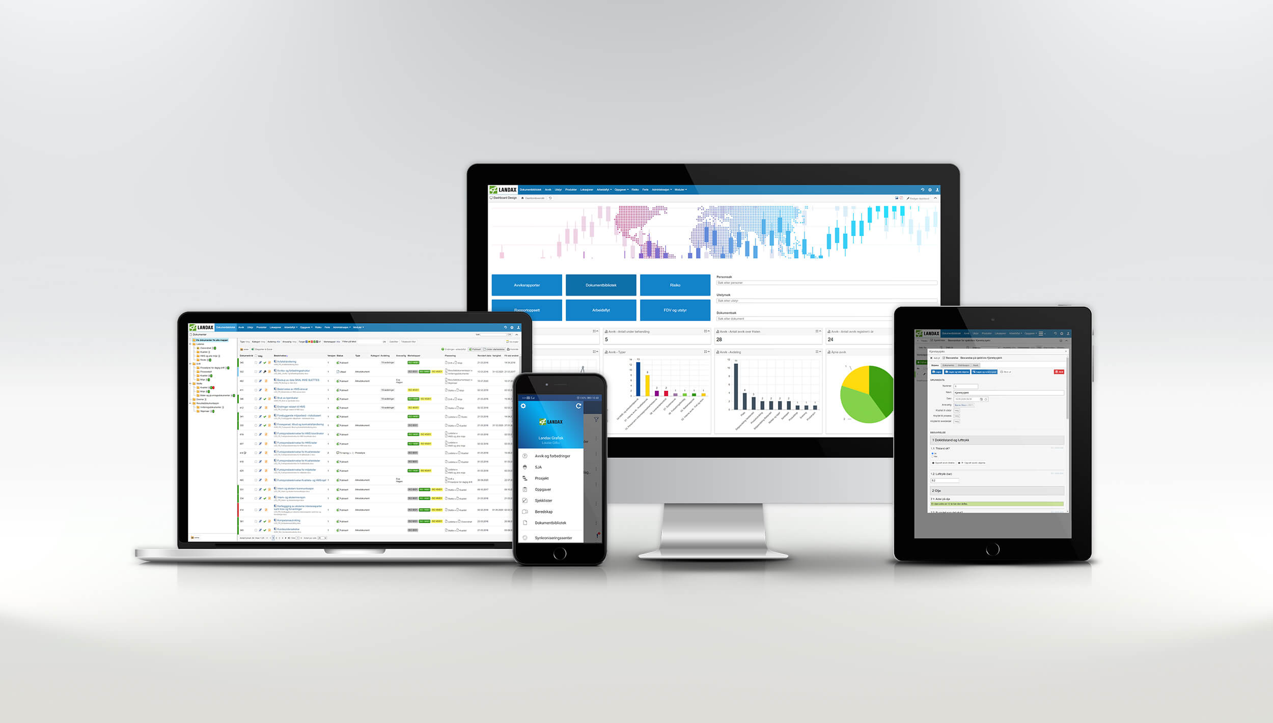 Dashbord-modulen i Landax benyttes som en forside for hele systemet. Her kan du legge inn viktige målinger, rapporter, snarveier, søkefelt og mye mer. Løsningen lar deg også opprette egendefinerte, tematiske dashbord for innsamling og visning av spesifikk informasjon.