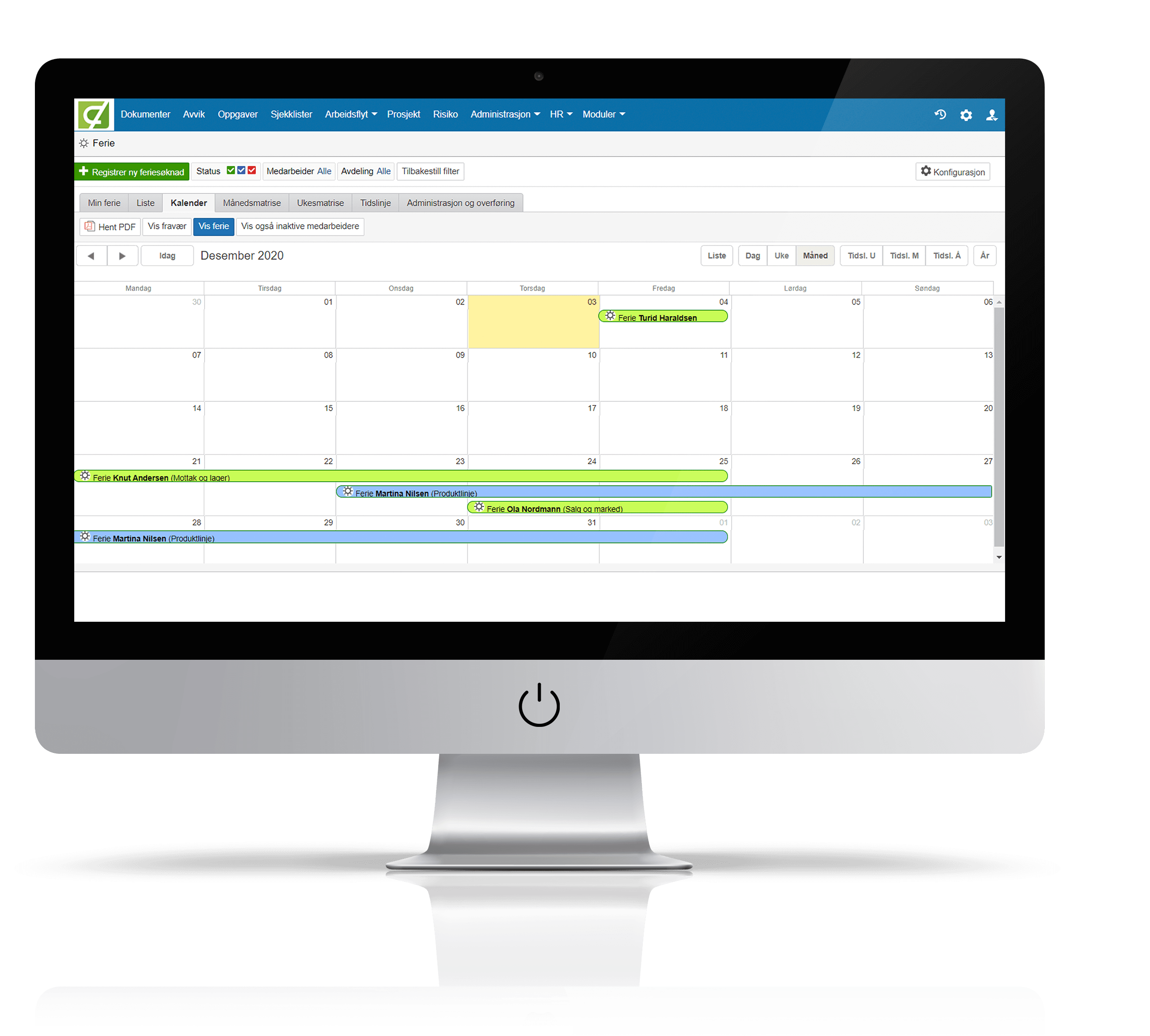 Feriemodulen til Landax lar deg hente ut ferieoversikten i en kalendervisning for en rask, visuell oversikt over bemanningssituasjonen i bedriften eller avdelingen. Du kan også hente ut kalenderen som PDF, og eksportere rapporter til Microsoft Excel.