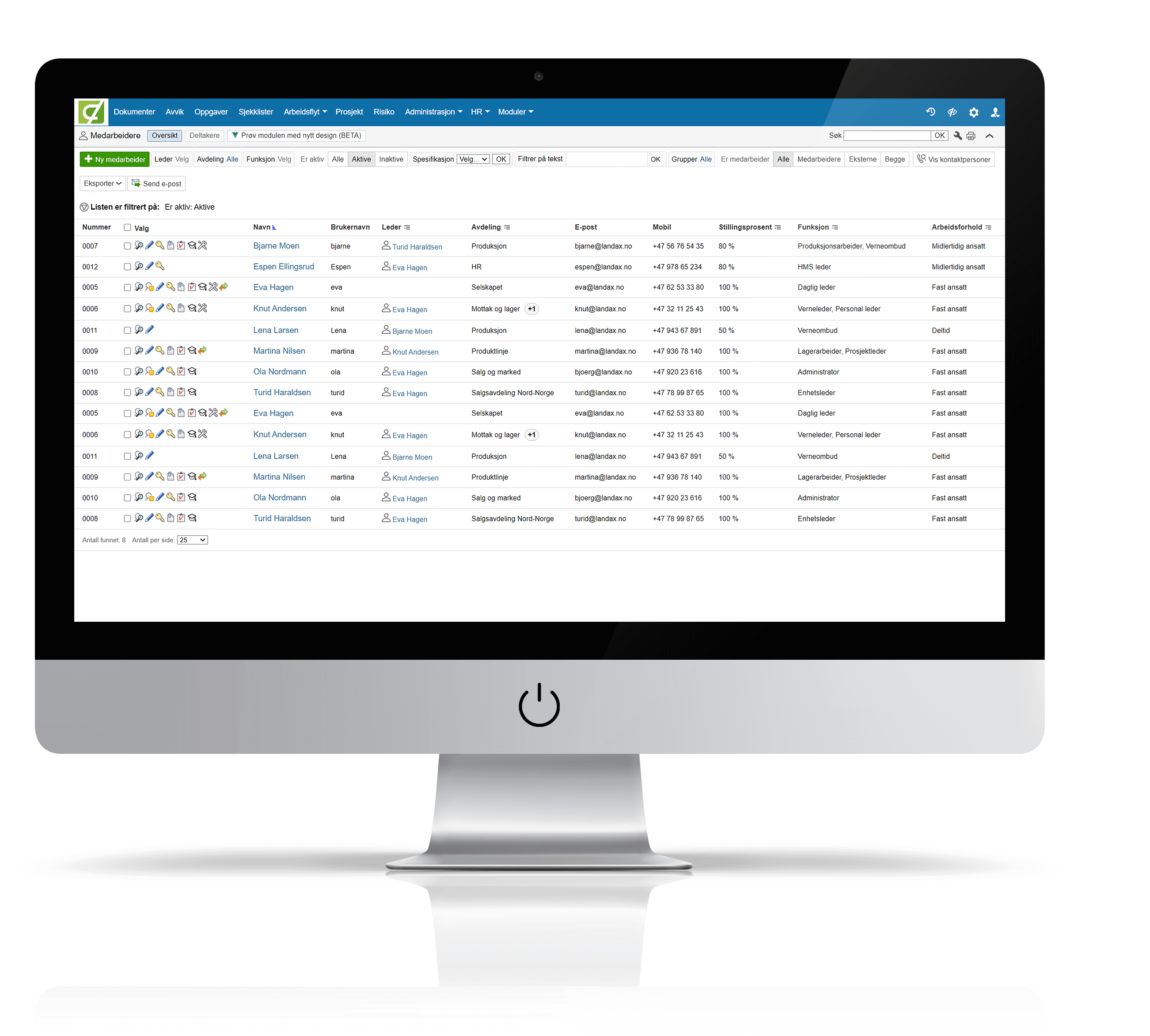 Modulen gir deg en liste over medarbeidere som inneholder informasjon som navn, kontaktinformasjon og merkelapper. Du får raskt oversikt over om det er knyttet til kompetanse, oppgaver, utstyr osv. ved hjelp av ikoner. Du kan også filtrere og søke i listen.