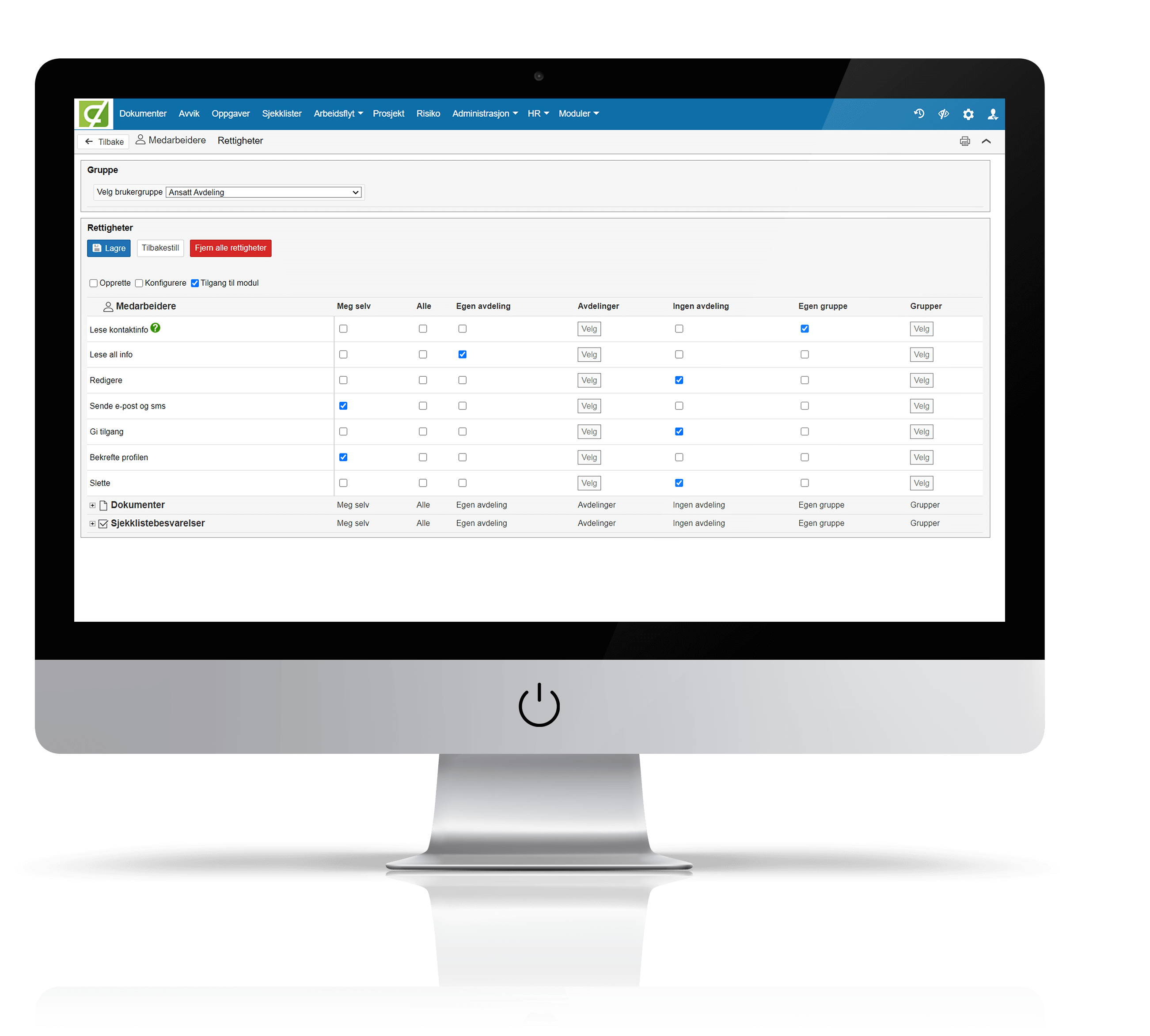 Landax-systemet tildeler rettigheter ved bruk av rettighetsgrupper. Disse gruppene og deres rettighetsoppsett kan konfigureres av systemadministrator etter eget ønske.
